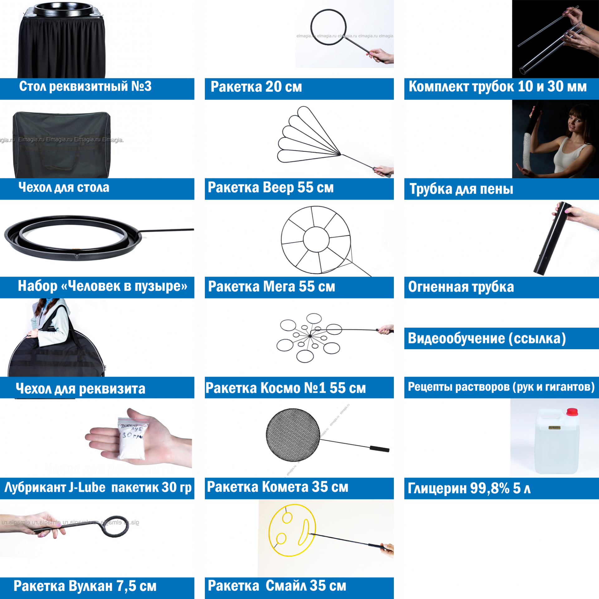 Мы подготовили для вас полноценное видеообучение с подробным описанием исполнения порядка 40 трюков, включающим в себя как азы, так и сложнейшие трюки. Так же включены типичные ошибки новичков, показано объяснение работы с нашим реквизитом, трюки на светящемся столе, трюки руками, трюки с дымом, горящие мыльные пузыри, работа с гигантскими пузырями.